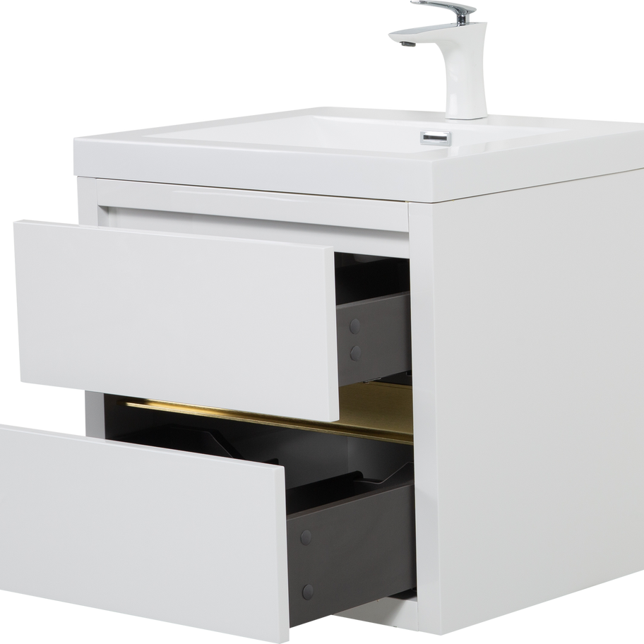 Upgrade your bathroom with the Allreno 24" Double Bathroom Vanity in White, designed to bring luxury and style to even the smallest of spaces. This sleek, wall-mounted vanity features elegant gold accents that complement the clean white finish, adding a modern touch to your bathroom. The durable stone countertop provides a sturdy and attractive surface for your daily essentials.