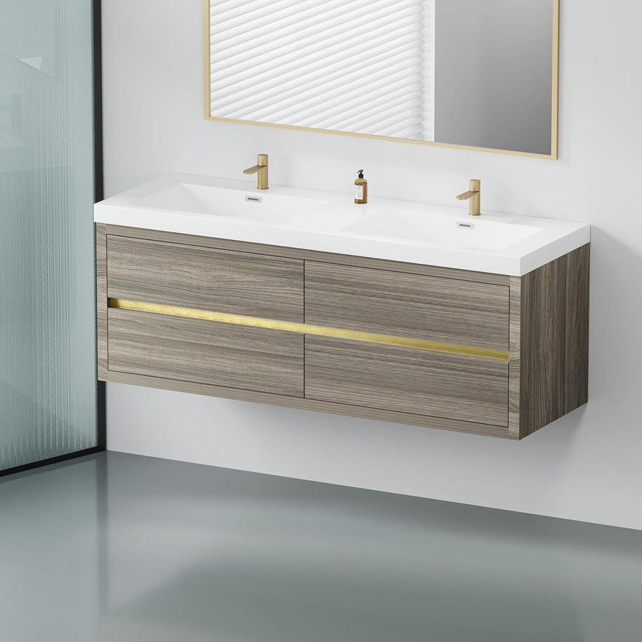 Upgrade your bathroom with the Allreno 60" Double Floating Bathroom Vanity in Ash Grey. This sleek, modern wall-mounted vanity features double sinks, offering ample space and functionality for shared bathrooms. The durable stone resin countertop provides a clean, sophisticated surface, while the soft-close drawers ensure smooth operation, keeping your bathroom organized.